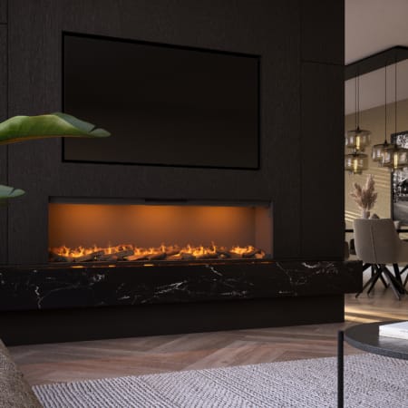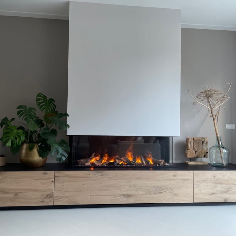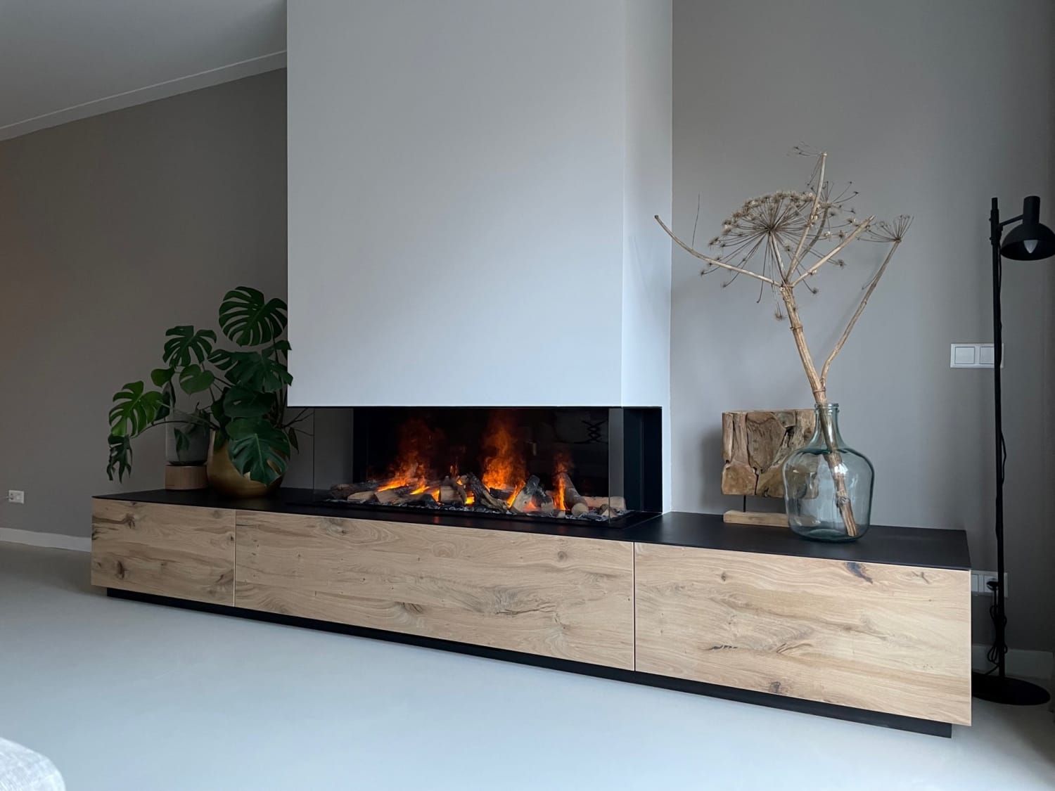 De E-MATRIX 1300-400 III, een duurzame elektronische haard, vormt samen met het bijpassende, strak ontworpen houten meubel een naadloze eenheid die esthetiek en innovatie uitstraalt. Het waterdampvuur zorgt voor een milieuvriendelijke ambiance.