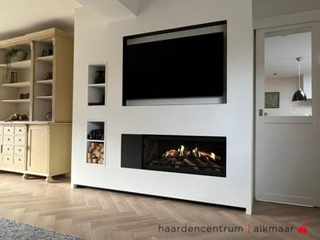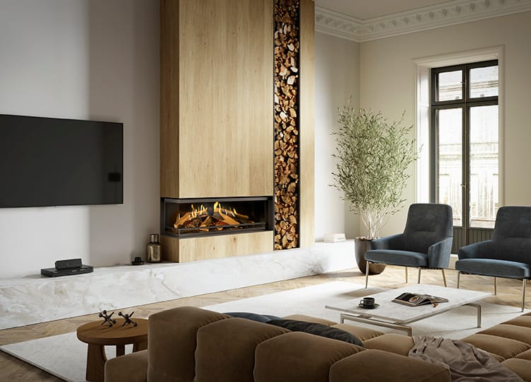 Ook als het vuur niet brandt zorgen de levensechte houtstammen in de haard ervoor dat de E-one een eye-catcher is in elk interieur