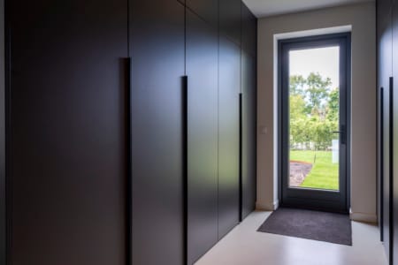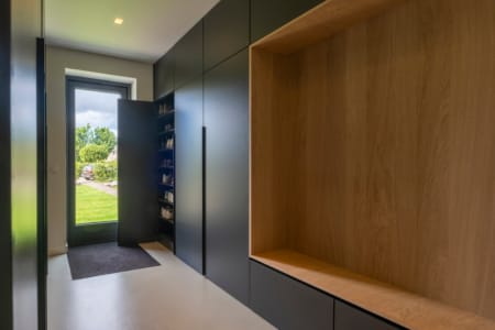 Het warme eiken interieur vormt een mooi contrast met de matte, donkere fronten en creëert een uitnodigende sfeer bij binnenkomst. De geïntegreerde nis met zitbank maakt de kast niet alleen functioneel, maar ook comfortabel in gebruik.