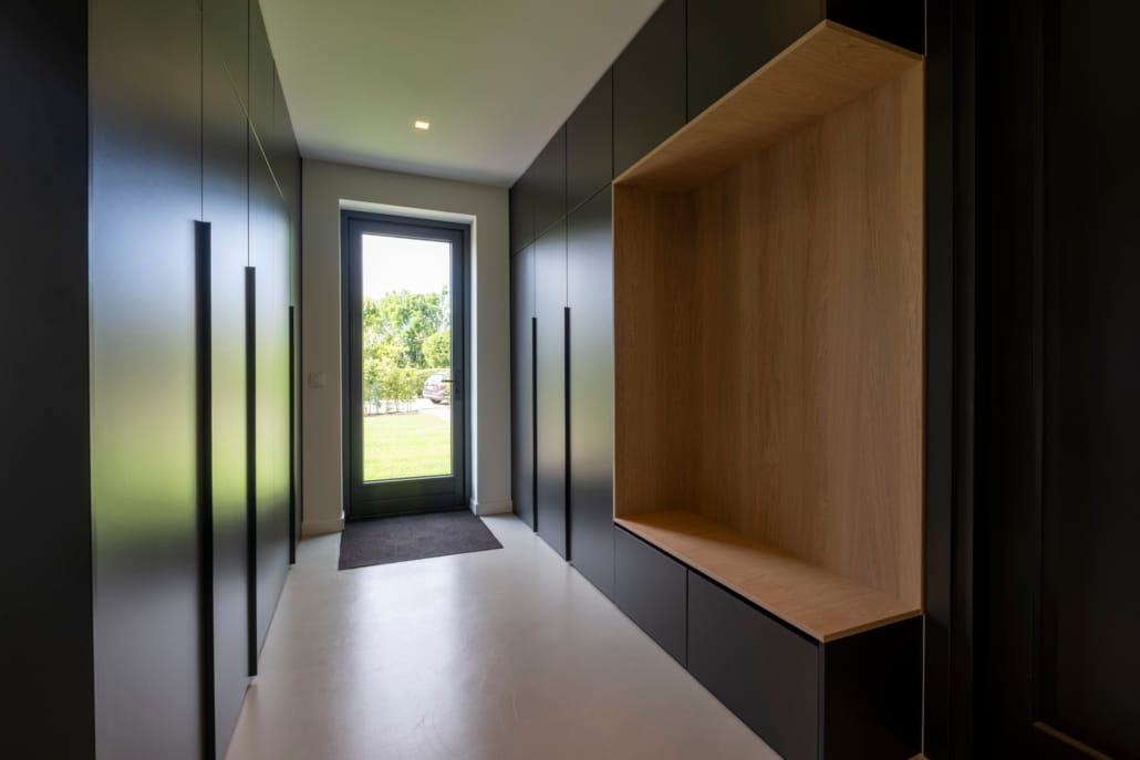 Het warme eiken interieur vormt een mooi contrast met de matte, donkere fronten en creëert een uitnodigende sfeer bij binnenkomst. De geïntegreerde nis met zitbank maakt de kast niet alleen functioneel, maar ook comfortabel in gebruik.