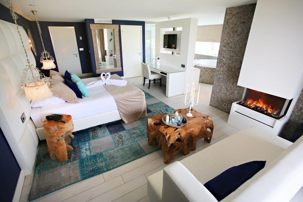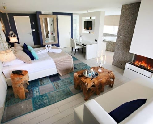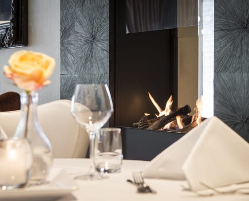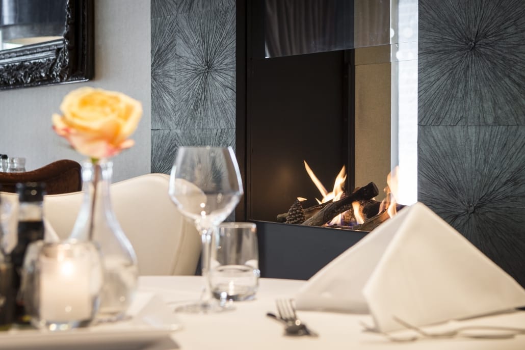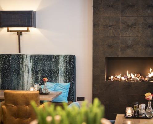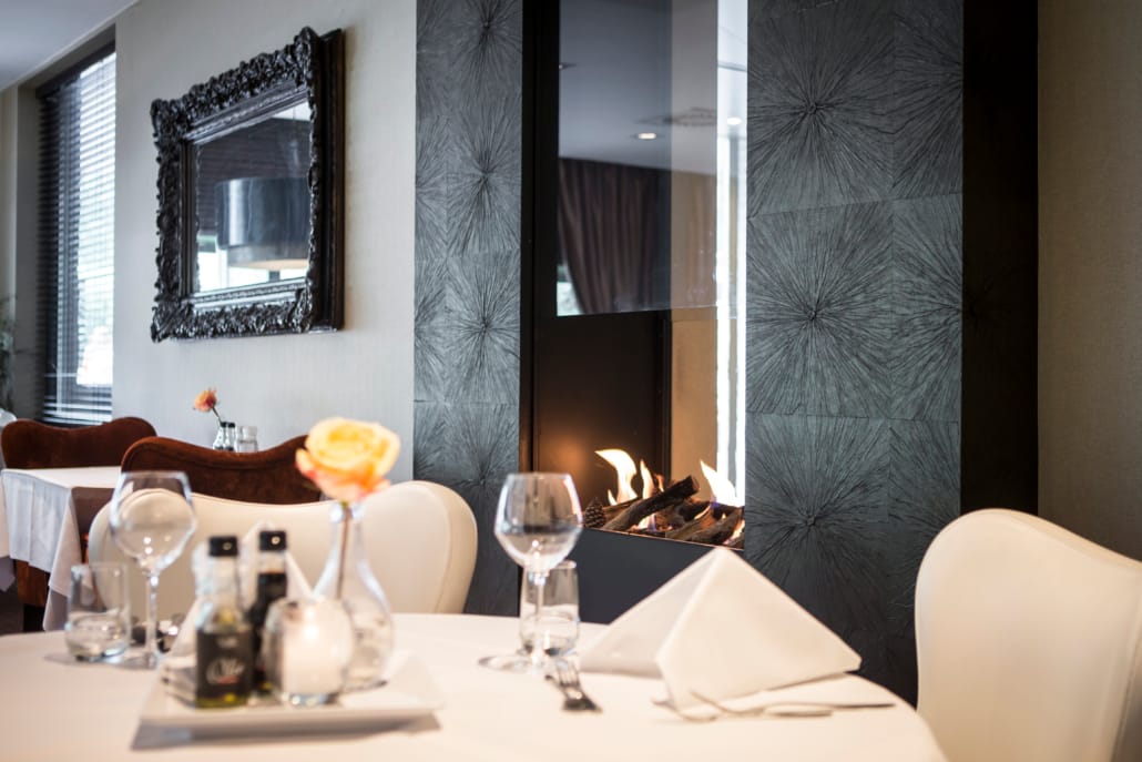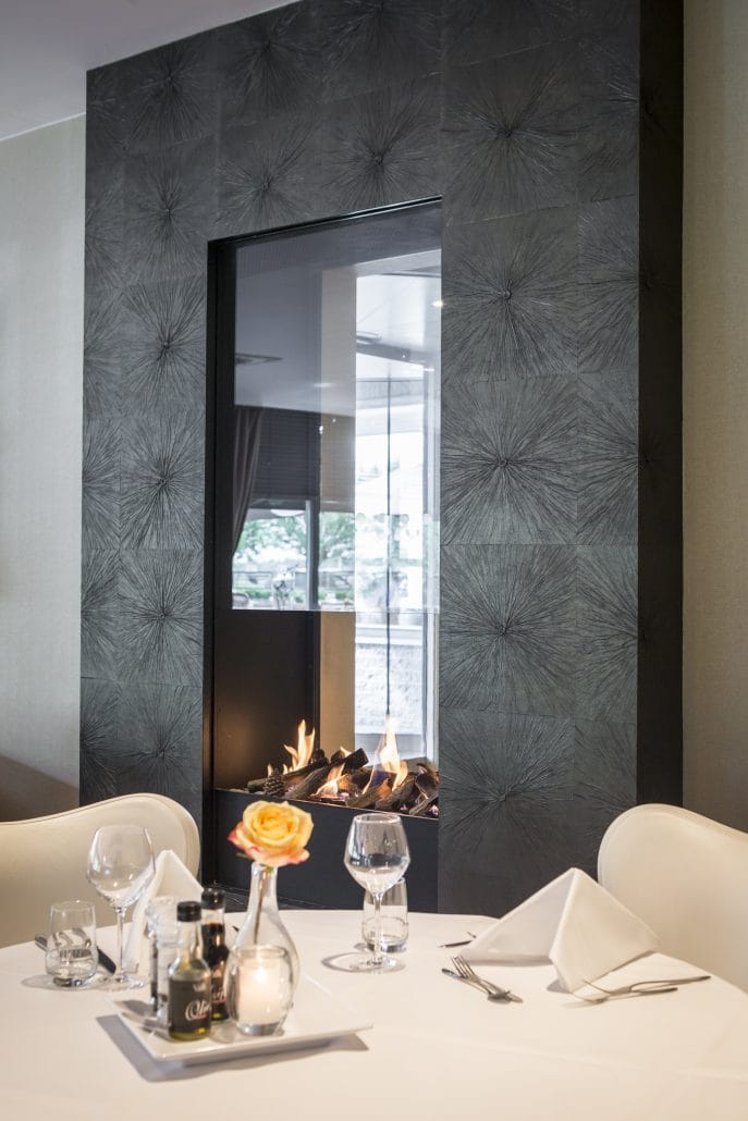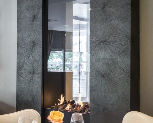 Nadat Haardencentrum Alkmaar voor Hotel Akersloot eerder al twee hotelkamers van een haard mocht voorzien, werd recent de opdracht verworven om in hetzelfde gebouw nog vier haarden te realiseren: twee open gashaarden in het restaurant, een hangende gashaard in de bar en een tunnelhaard tussen de lobby en het restaurant. “Bij de keuze voor deze haarden en de technische installatie is goed gekeken naar bestaande installaties in het gebouw. Zoals de grote ventilatoren in de nabijgelegen keuken”, zegt Leander. “Die vergroten de kans dat rookgassen van de haard terug de ruimte in worden gezogen. Daar moet je dus op anticiperen.” De haard tussen restaurant en lobby kreeg op aangeven van de architect een mooie. “Daarbij was gedacht vanuit het restaurant. Van daaruit moest men op het vuur kunnen kijken”, zegt Leander. “Maar eenmaal geplaatst, bleek de haard vanuit de hal bezien te laag en zou hij eigenlijk zo’n dertig, veertig centimeter omhoog moeten. Daar hebben wij een creatieve oplossing voor bedacht, zonder al te veel te hoeven slopen.”