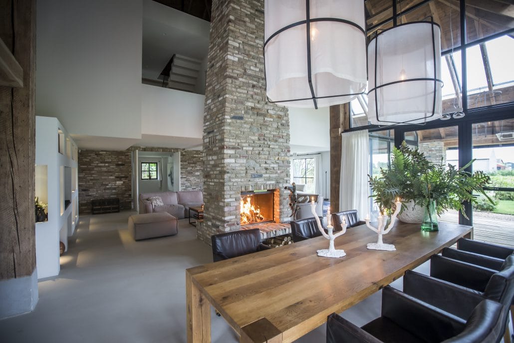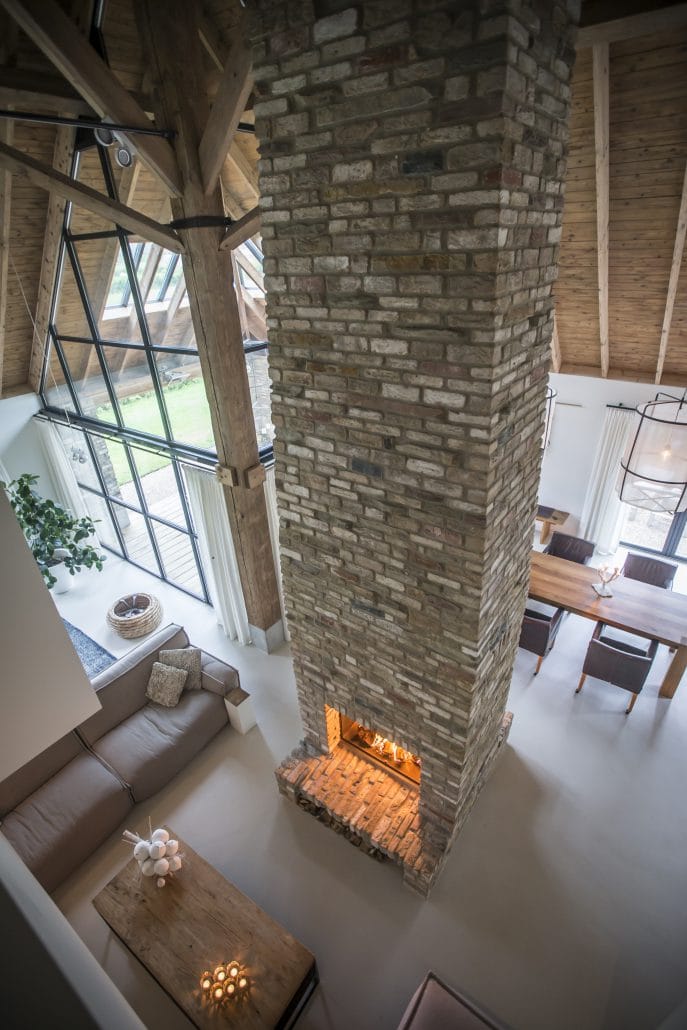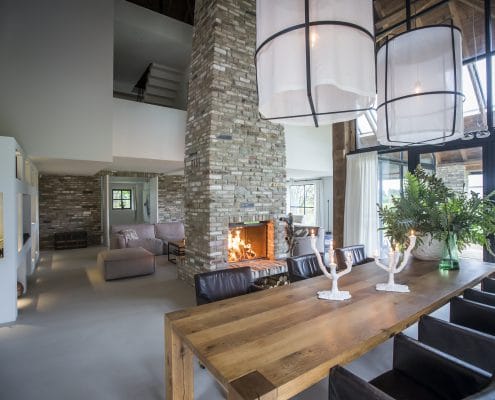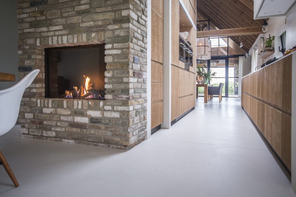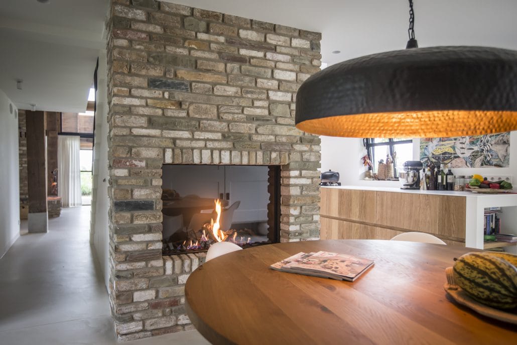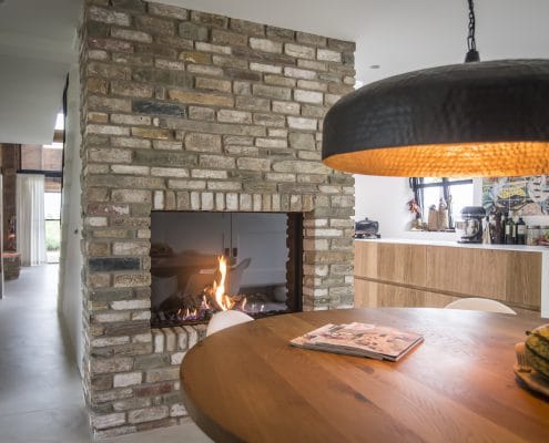 Tijdens de renovatie van de stolp, die zo’n jaar in beslag nam, werden de oude haard en het tien (!) meter lange rookkanaal door Haard en Interieur Alkmaar volledig in ere hersteld. Op de plek van de bestaande haard werd een Totem tunnel- ofwel doorkijkhaard geïnstalleerd, aan beide zijden uitgerust met een modern liftdeur systeem. Met liftdeuren open is het volop genieten van knapperend houtvuur, dicht fungeert de haard als behaaglijke kachel met hoog rendement. In het verlengde van de keuken werd nog een tweede haard geplaatst: de gashaard van Tulp B100 hoog. Een moderne, stalen gashaard met dubbele brander en fraai vlambeeld, die – net als de Totem tunnelhaard – helemaal tot z’n recht komt in deze prachtig gerenoveerde stolp.