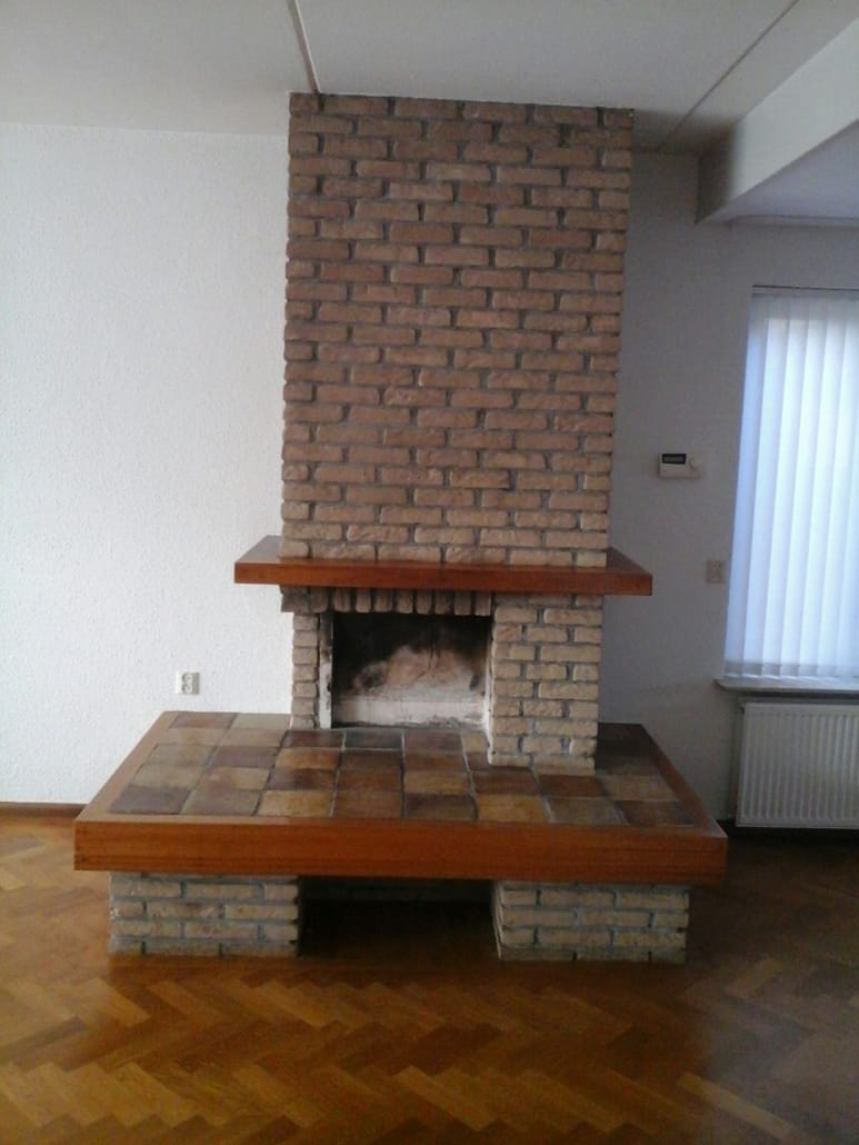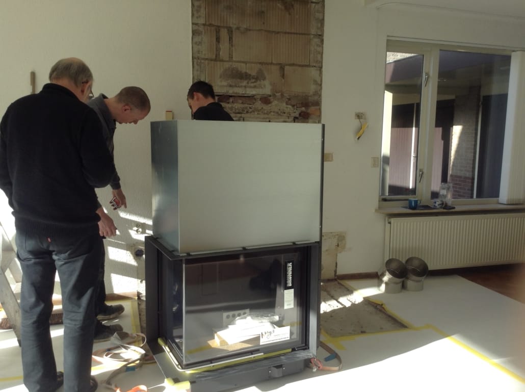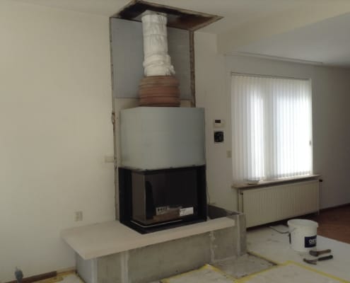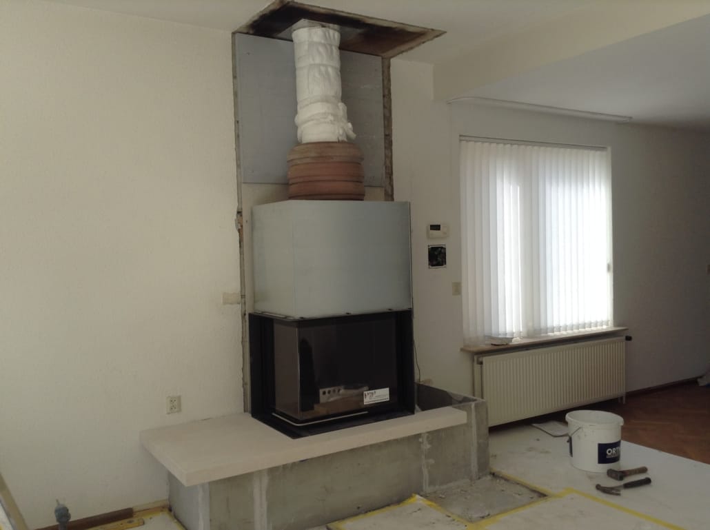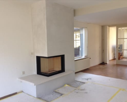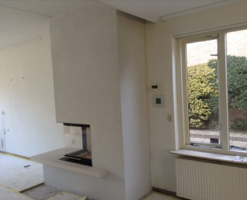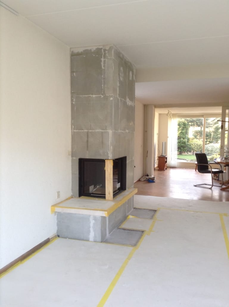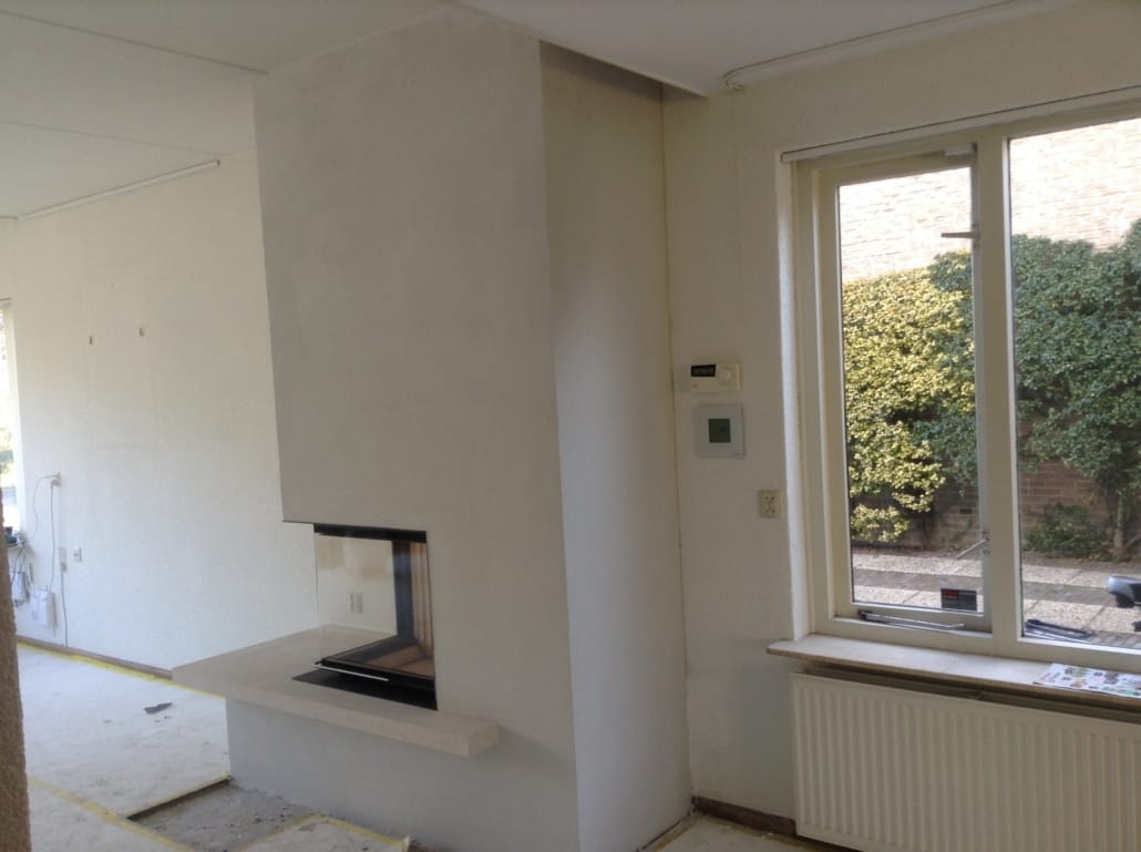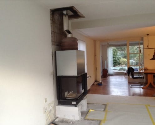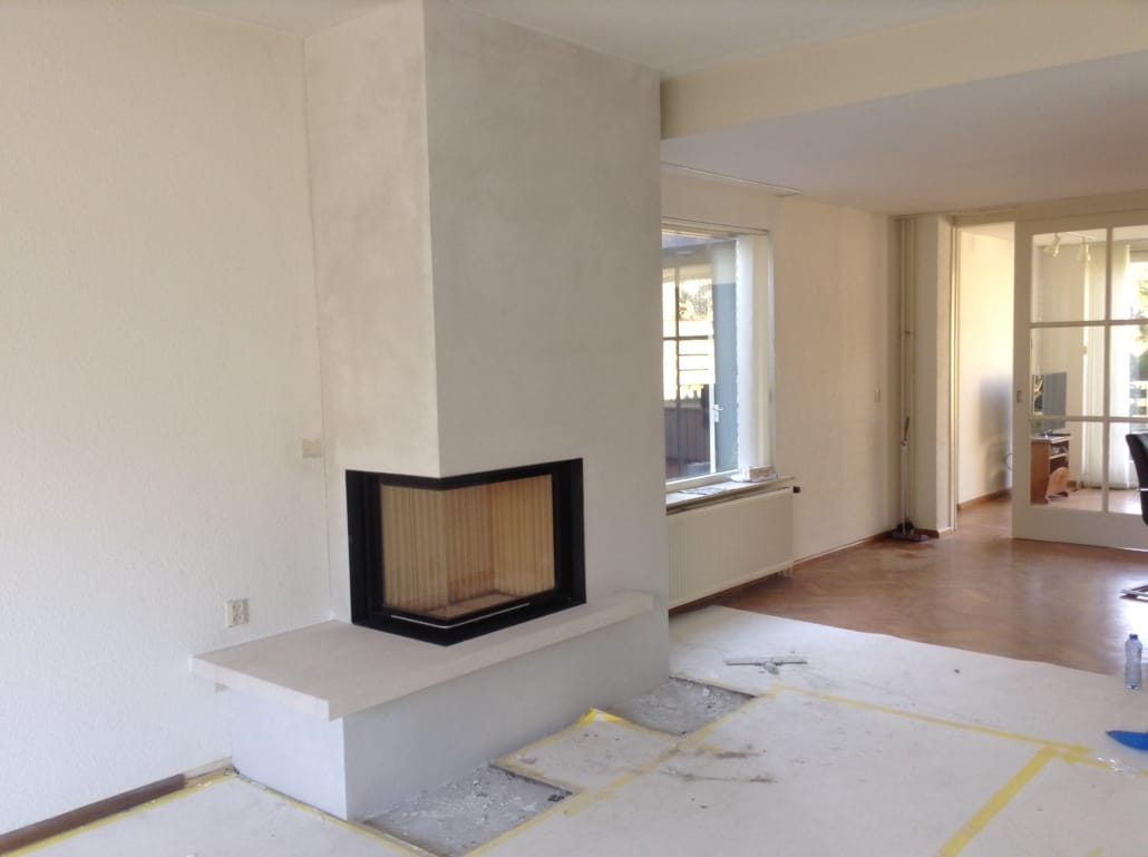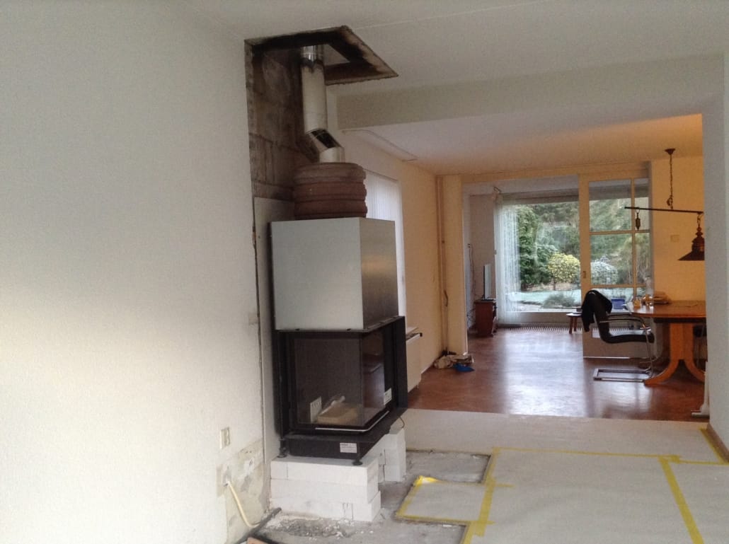 De installatie van een nieuw afzuigsysteem in de keuken was mede aanleiding voor de zoektocht van de familie Purmer naar een oplossing voor het rookgasprobleem. “Door de afzuiging ontstond een negatieve trek, waardoor rookgas in de kamer belandde”, zegt mevrouw Purmer. “Deurtjes leken ons een goede oplossing. Maar eigenlijk wilden we ook de woonkamer veranderen. Die was toch wat gedateerd. De openhaard was nog een echte jaren zeventig haard met een plateau, dat flink de kamer in stak. We besloten het geheel om te vormen tot iets wat effectiever is en veilig kan branden, zodat je gewoon boodschappen kunt doen terwijl de haard brandt. En het moest ook buiten minder luchtvervuiling geven.”