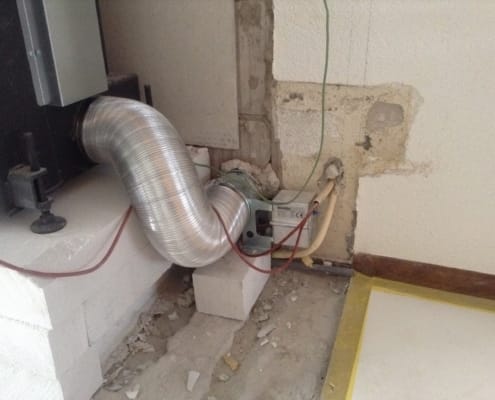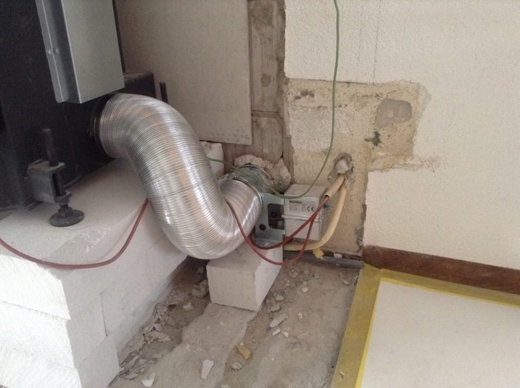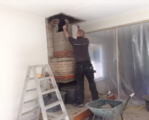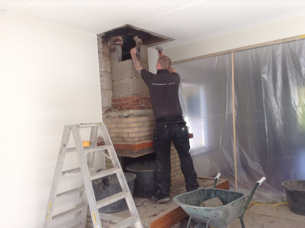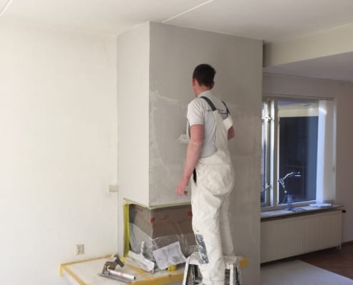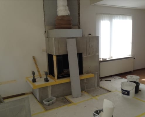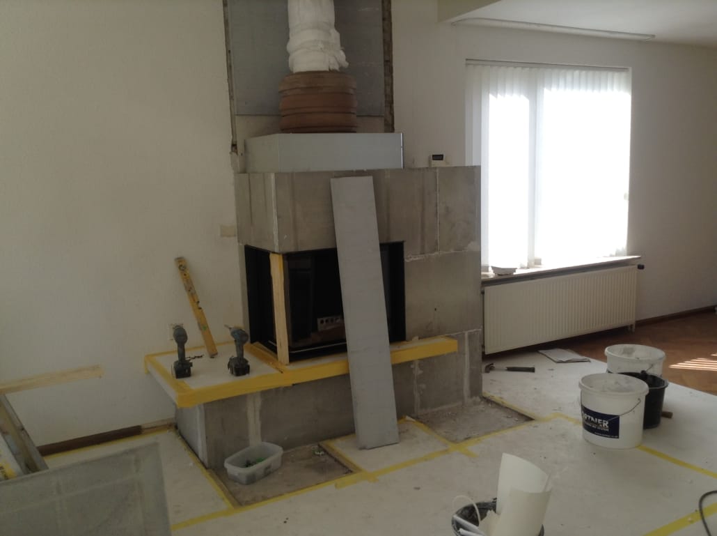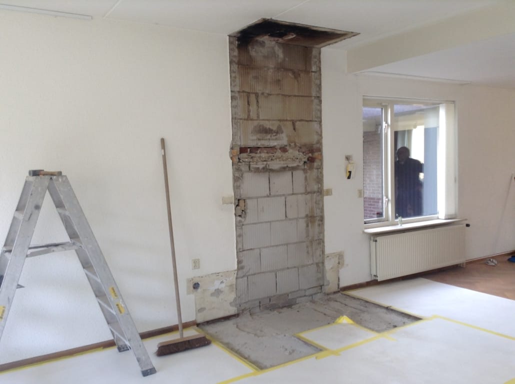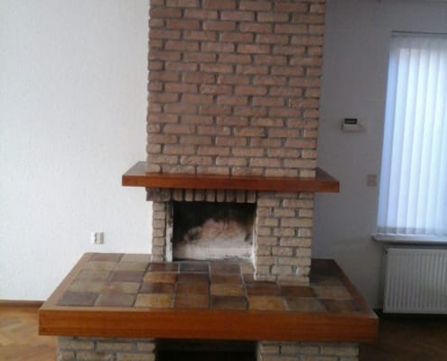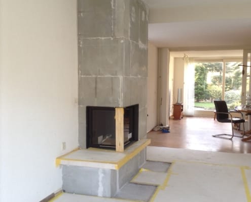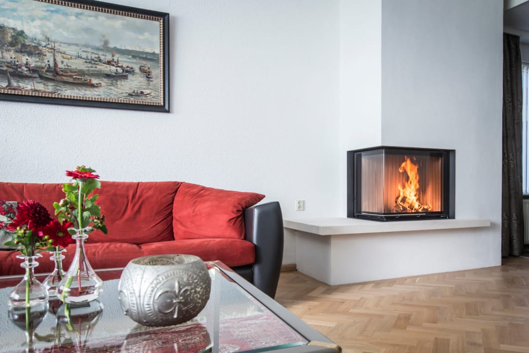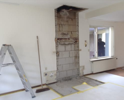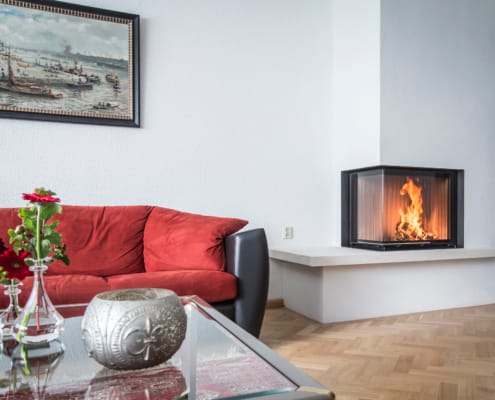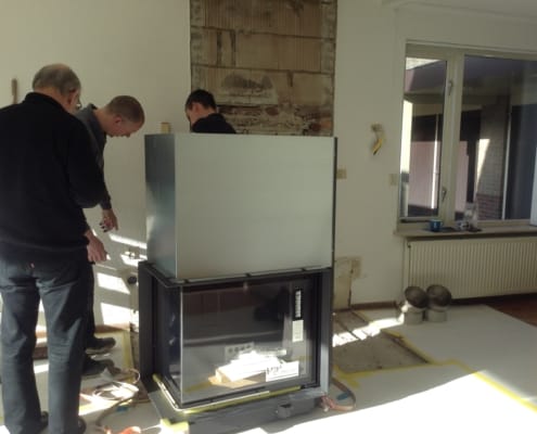 De installatie van een nieuw afzuigsysteem in de keuken was mede aanleiding voor de zoektocht van de familie Purmer naar een oplossing voor het rookgasprobleem. “Door de afzuiging ontstond een negatieve trek, waardoor rookgas in de kamer belandde”, zegt mevrouw Purmer. “Deurtjes leken ons een goede oplossing. Maar eigenlijk wilden we ook de woonkamer veranderen. Die was toch wat gedateerd. De openhaard was nog een echte jaren zeventig haard met een plateau, dat flink de kamer in stak. We besloten het geheel om te vormen tot iets wat effectiever is en veilig kan branden, zodat je gewoon boodschappen kunt doen terwijl de haard brandt. En het moest ook buiten minder luchtvervuiling geven.”