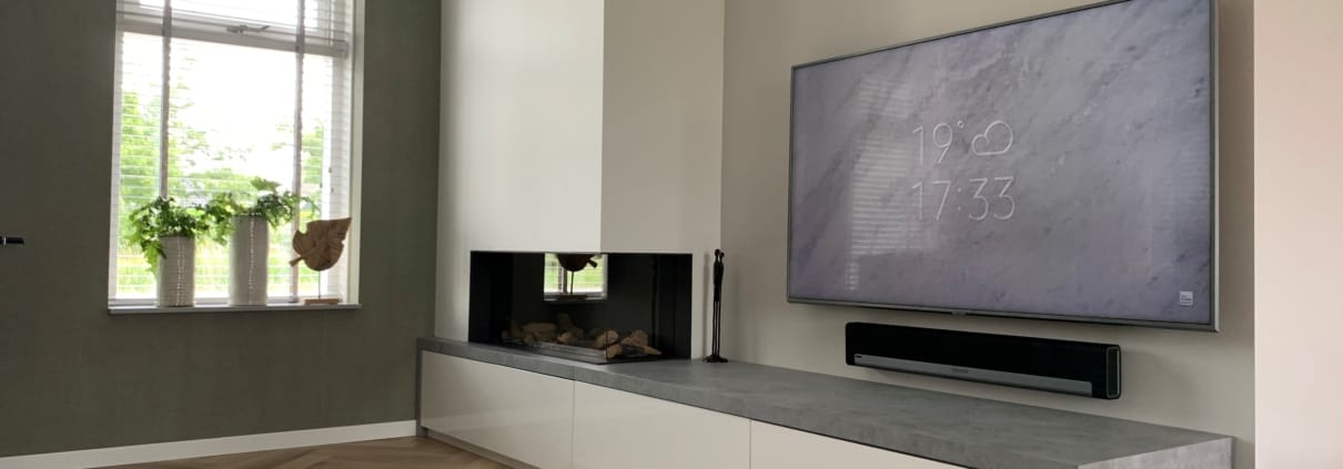 Voor de familie Siewertsen mochten wij deze gashaard hoek van Bellfires plaatsen in combinatie met een op maat gemaakt meubel voor de audio apparatuur. Het dressoir is voorzien van een HPL betonlook. Een prachtige combinatie.