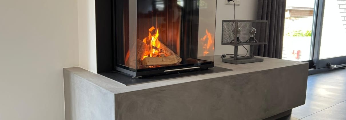 Door ons gerealiseerd deze hout gestookte Brunner haard, plateau afgewerkt met beton ciré.
