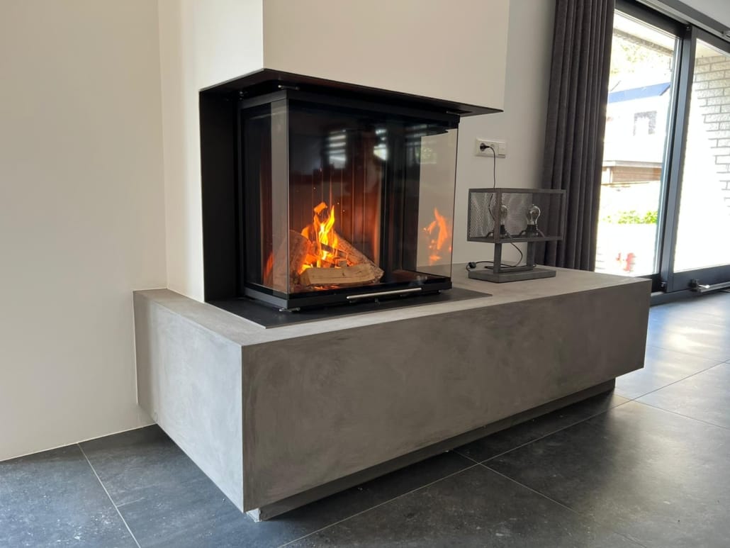 Door ons gerealiseerd deze hout gestookte Brunner haard, plateau afgewerkt met beton ciré.