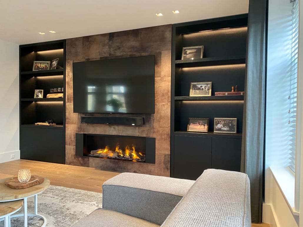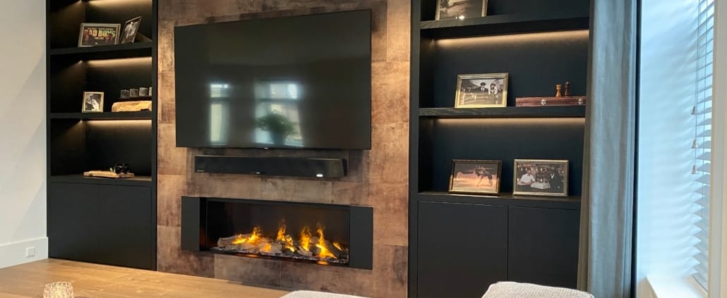 Voor Bart en Marga mochten wij deze Cinewall realiseren met een Faber E-matriX 1300 front, de boezem is afgewerkt met alphenberg leer en de maatwerkasten in Fineer zwart