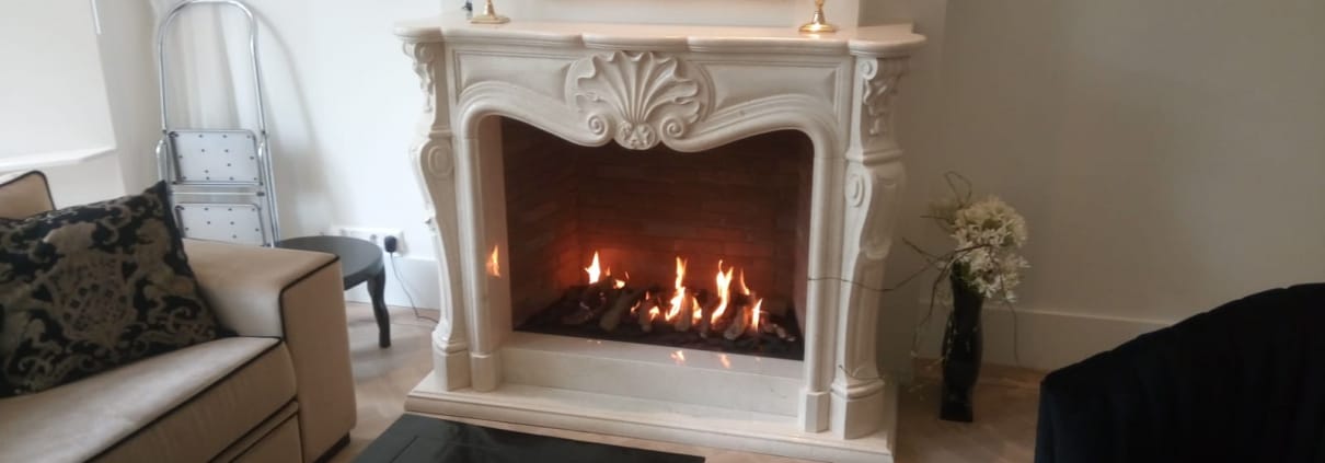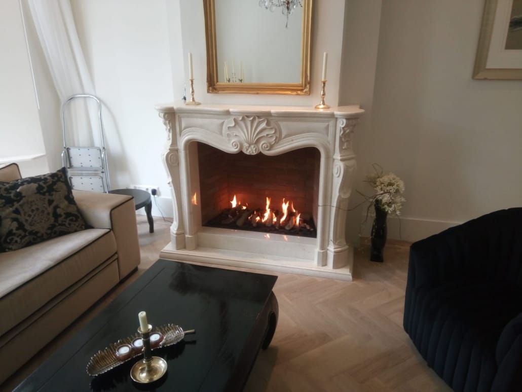 Een maatwerk open gashaard met een keramische achterwand. Ingelijst in een prachtige natuurstenen schouw. Naar eigen ontwerp van familie Mooij vervaardigd in de steensoort Creme Marfil. Een klassieker!