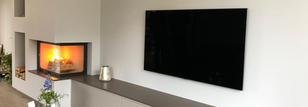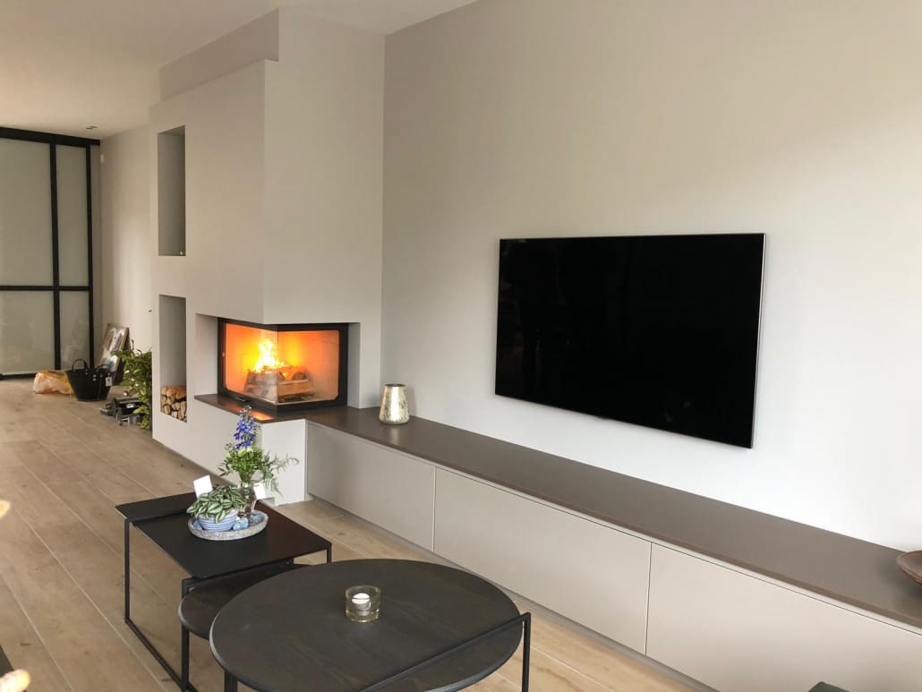 Voor Martin & Willemijn mochten wij in Volendam deze prachtige haardopstelling verzorgen. Een liftdeurhaard hoek 800 van Totem in combinatie met een op maat gemaakt meubel voor de audio apparatuur. Het dressoir is voorzien van een keramisch plateau. De nissen naast de haard vormen een praktische opslag voor het stookhout.