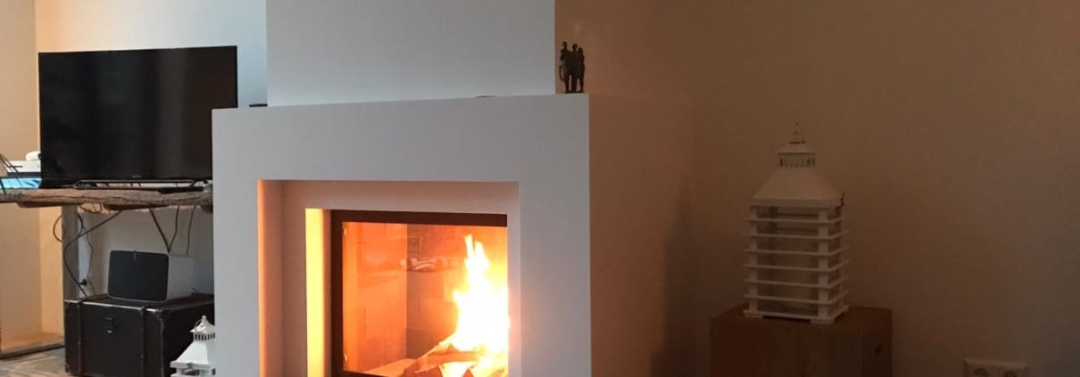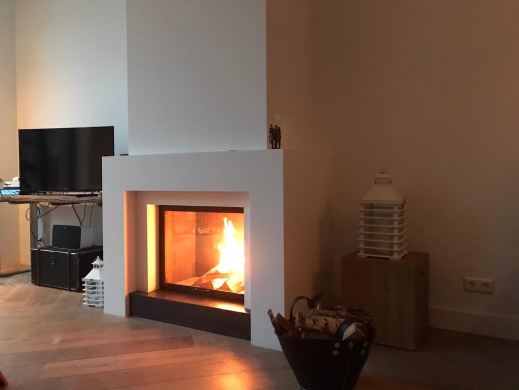 Bij Jaap-Steven en Aimée mochten wij in hun nieuwgebouwde riante herenhuis deze houthaard van Totem plaatsen ingekleed in een modern gestucte schouw.